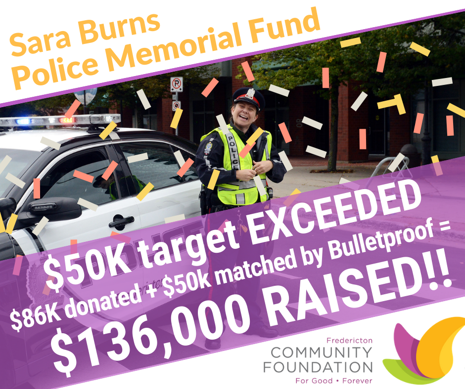 Fredericton, NB, October 18, 2018 – The Sara Burns Police Memorial Fund raised $136K during a highly successful one-month donation-matching campaign launched by the fund and supported by local IT and cybersecurity company, Bulletproof. 100% of the funds raised will go to helping people in need in our communities.